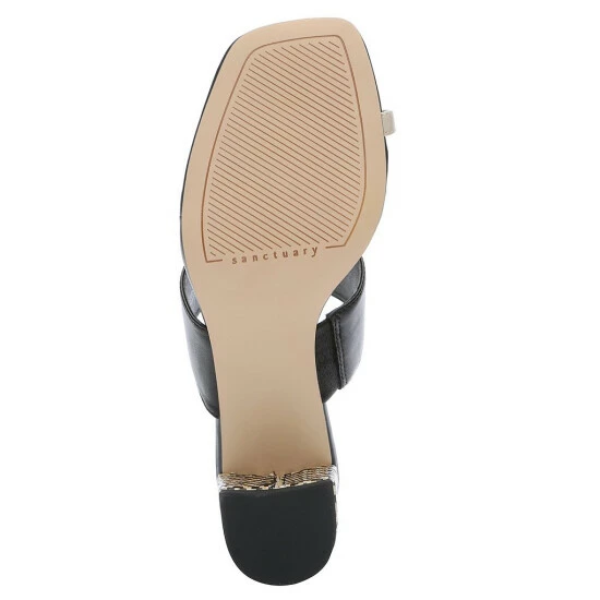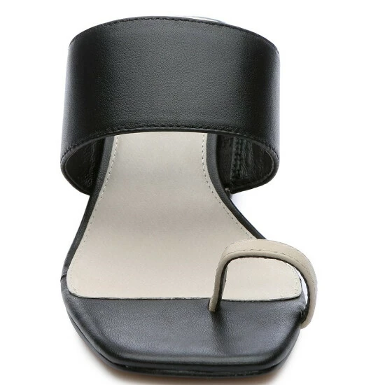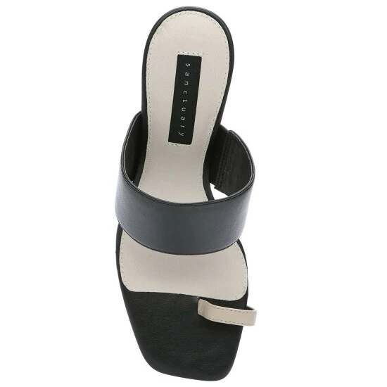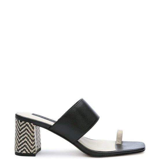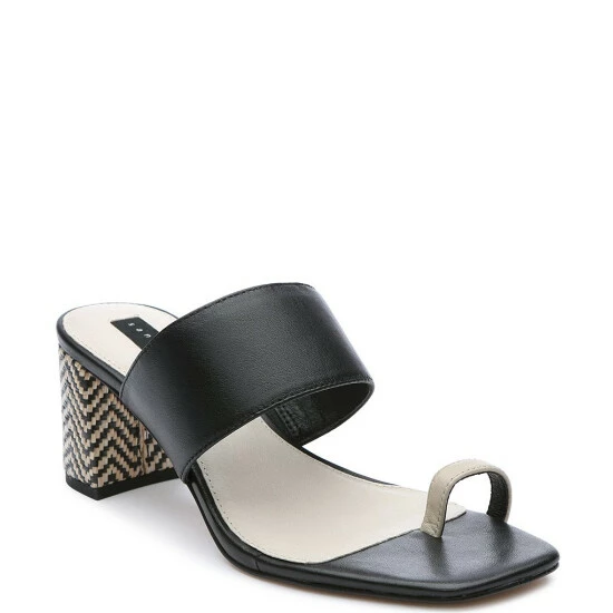 From Sanctuary, the Bold Leather Toe Loop Chevron Stripe Heel Sandals feature: